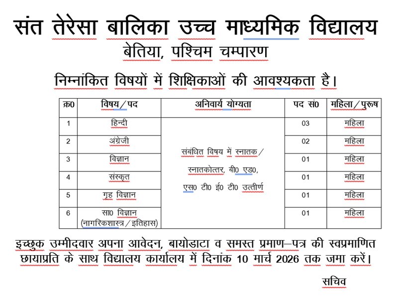 Welcome to St. Teresa\'s Girls Senior Secondary School, Bettiah, West Champaran